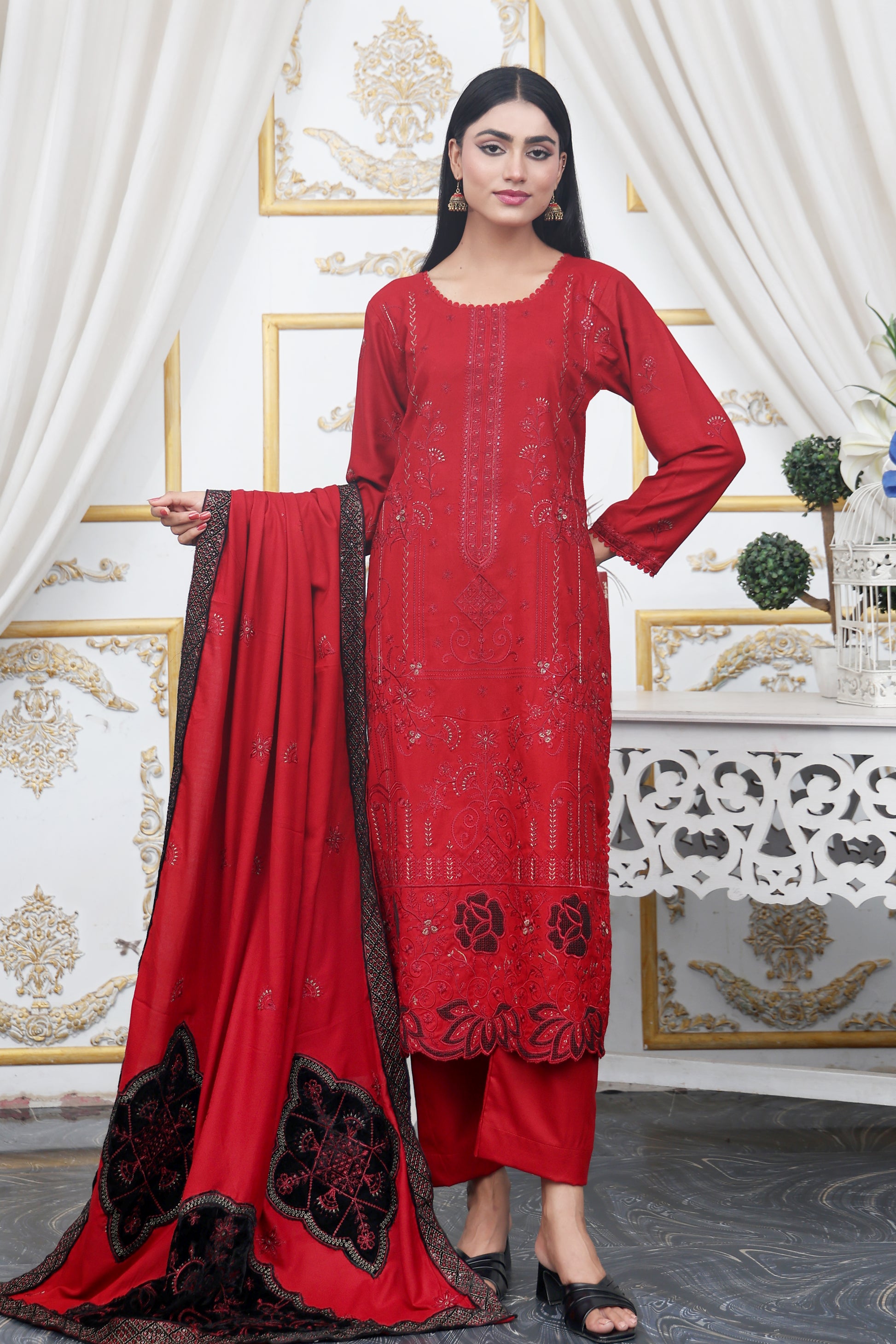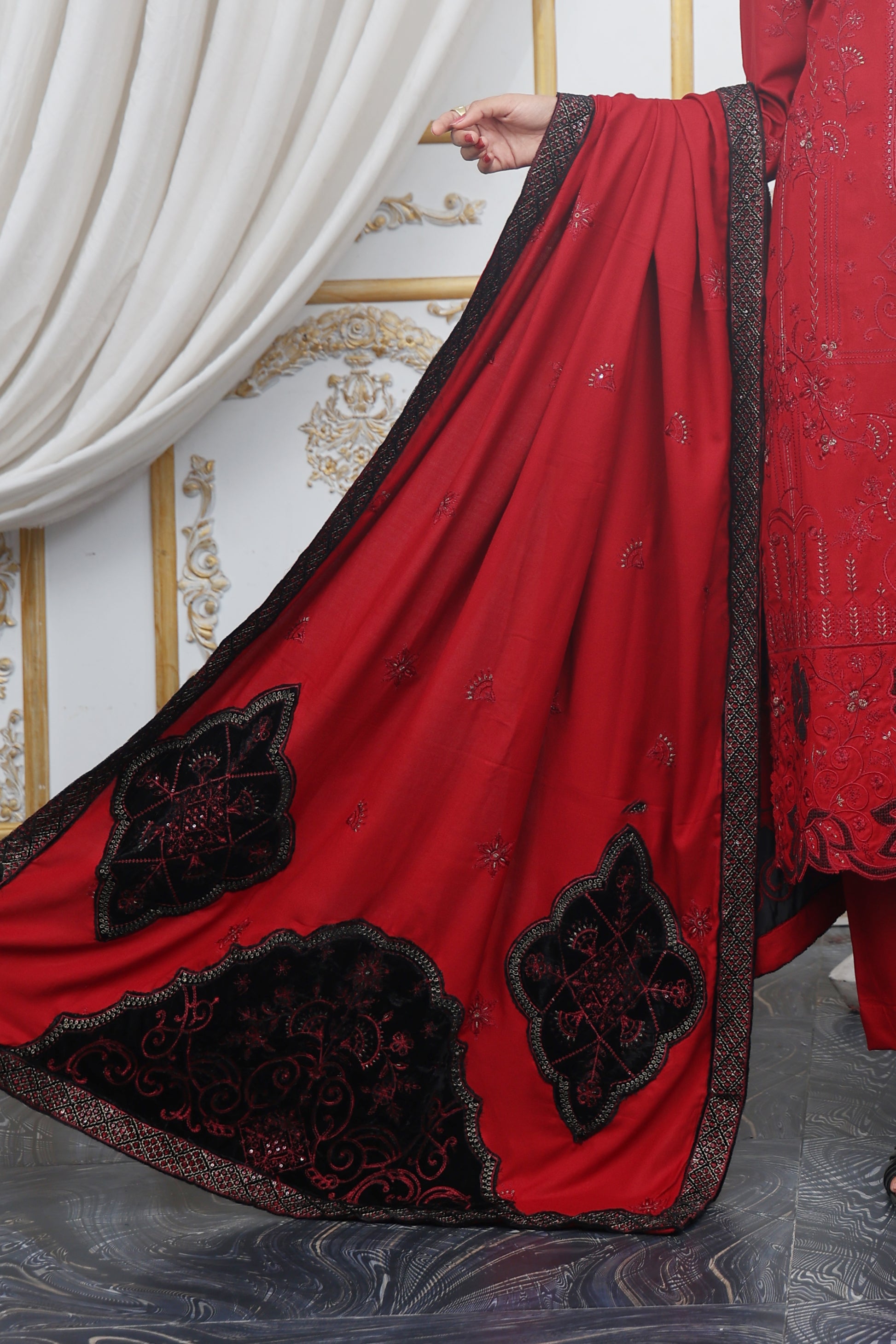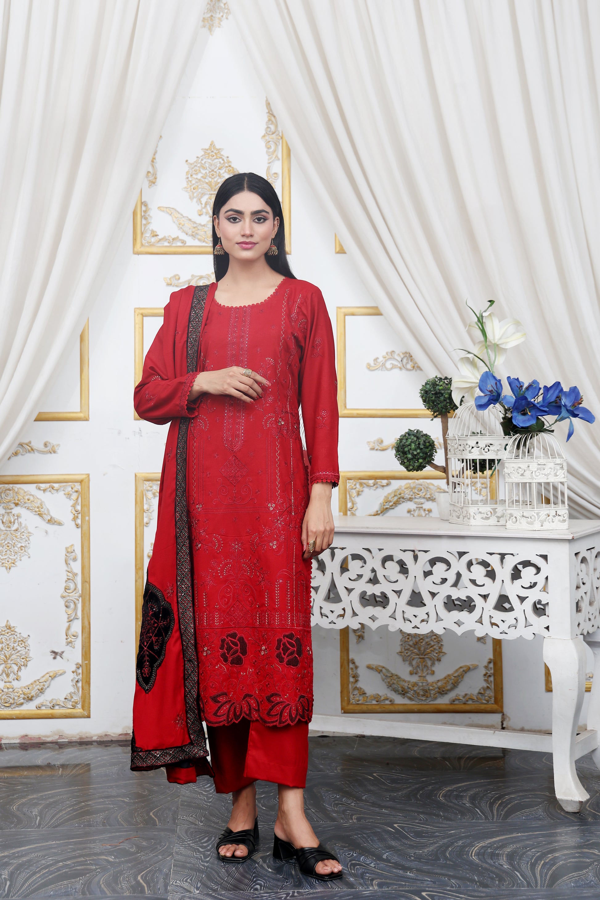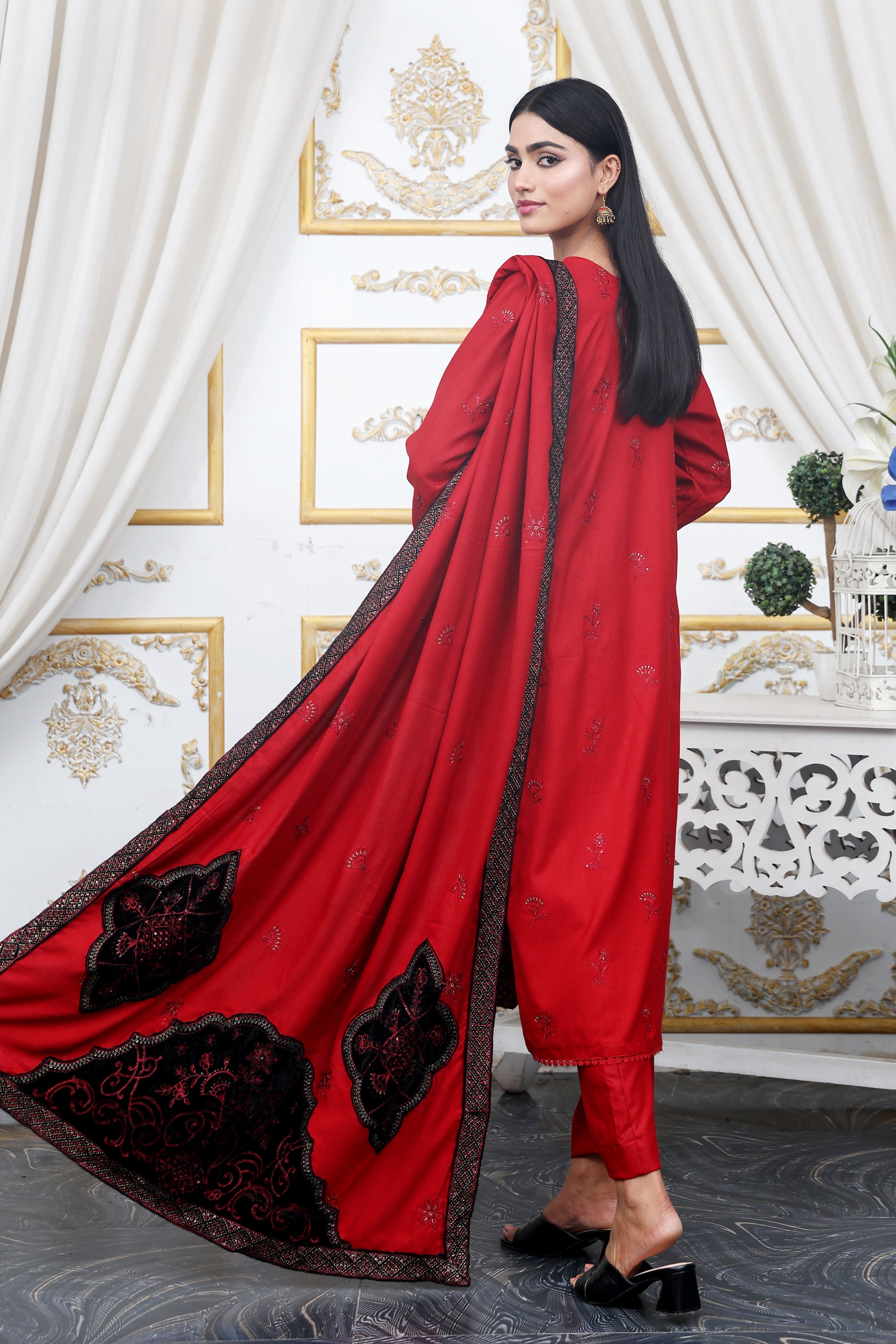This three-piece dhanak set includes a premium embroidered shirt with front, back, and sleeves, an embroidered shawl with velvet patches, and a plain dhanak trouser.