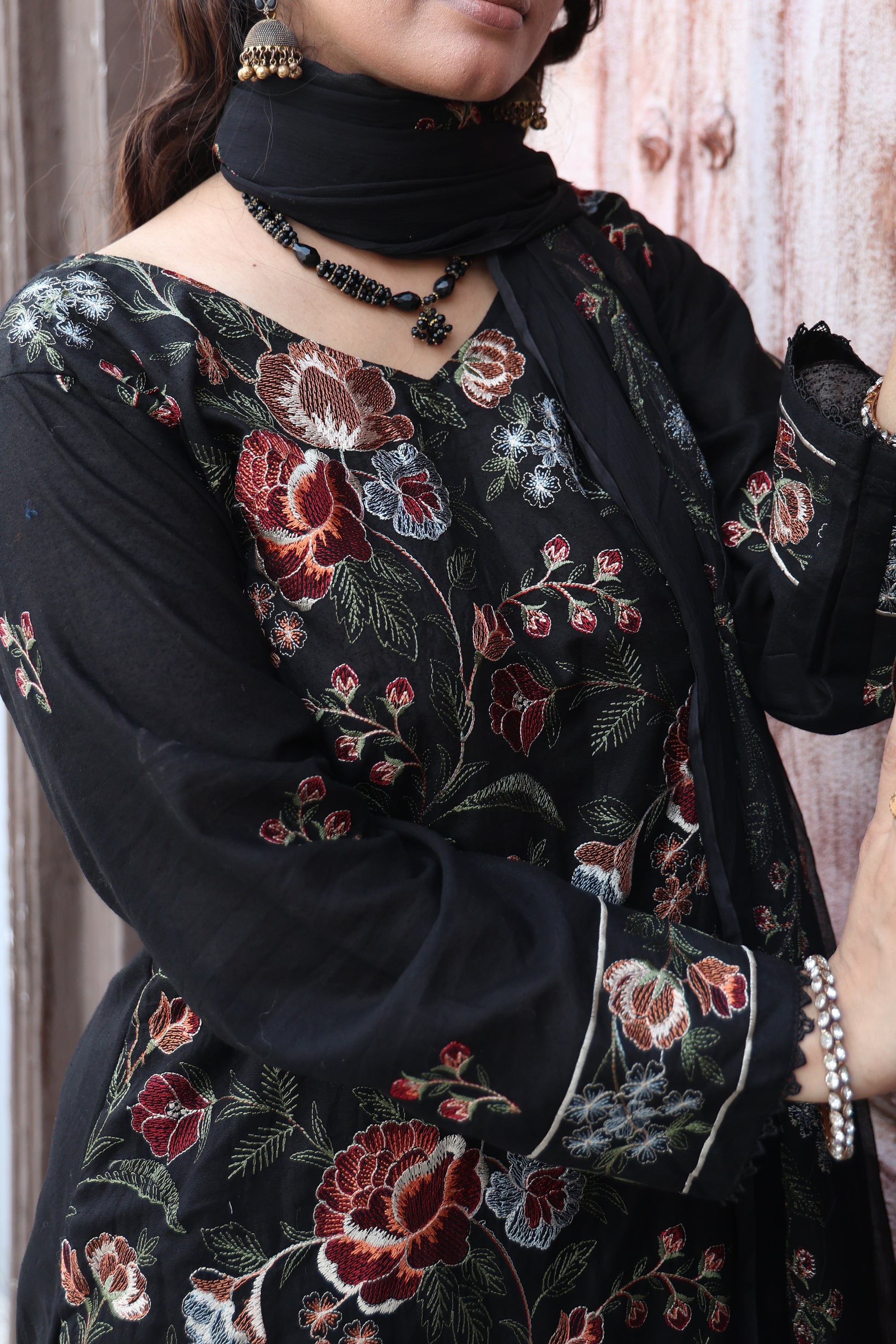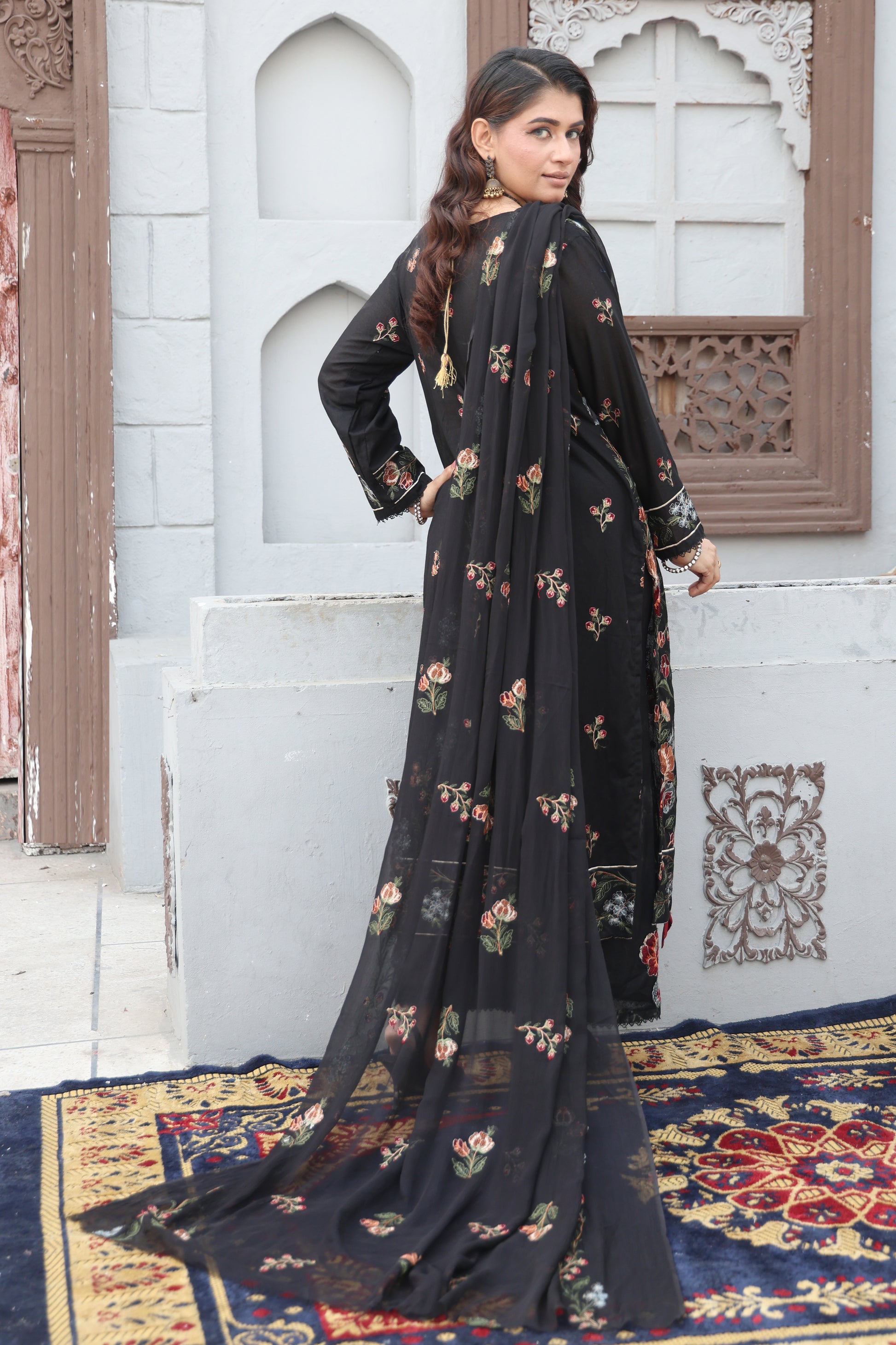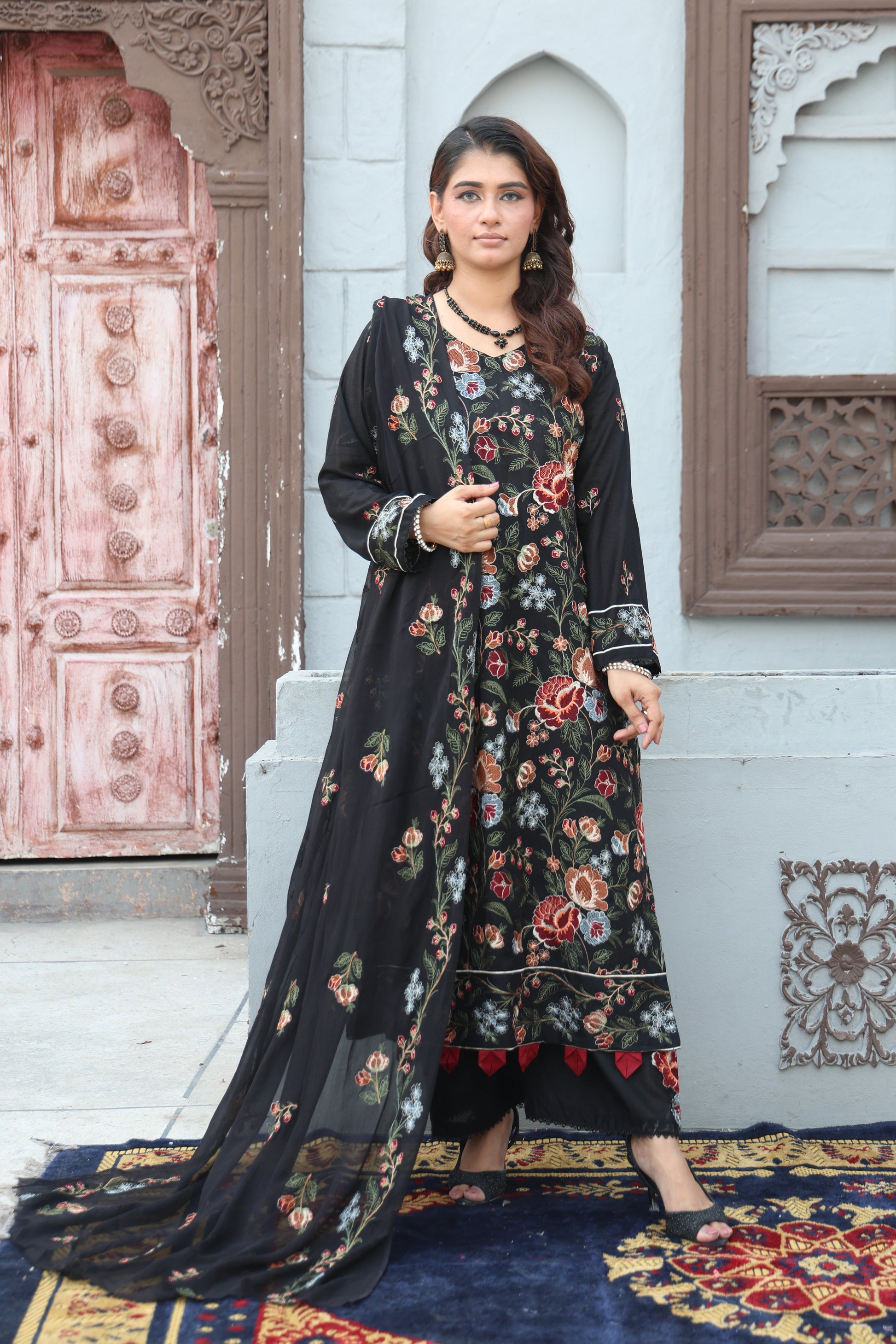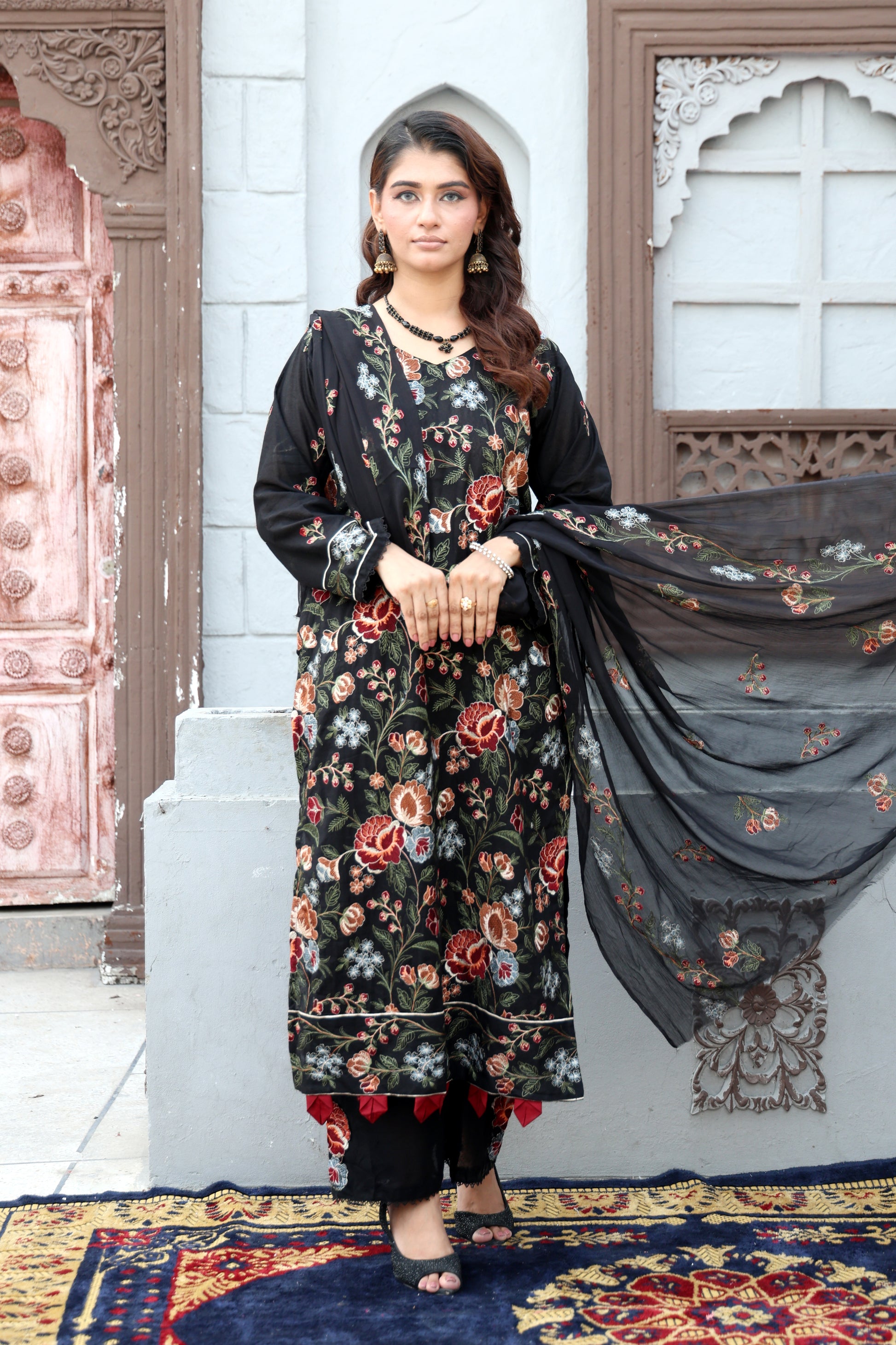 Premium Karandi shirt with delicate embroidery on the front, back, and sleeves, paired with a crinkle dupatta with embroidery and a plain Karandi trouser.