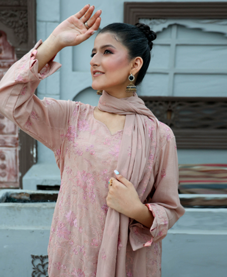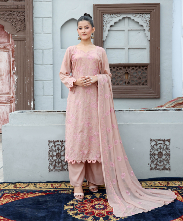 Premium Karandi shirt with delicate embroidery on the front, back, and sleeves, paired with a crinkle dupatta with embroidery and a plain Karandi trouser.