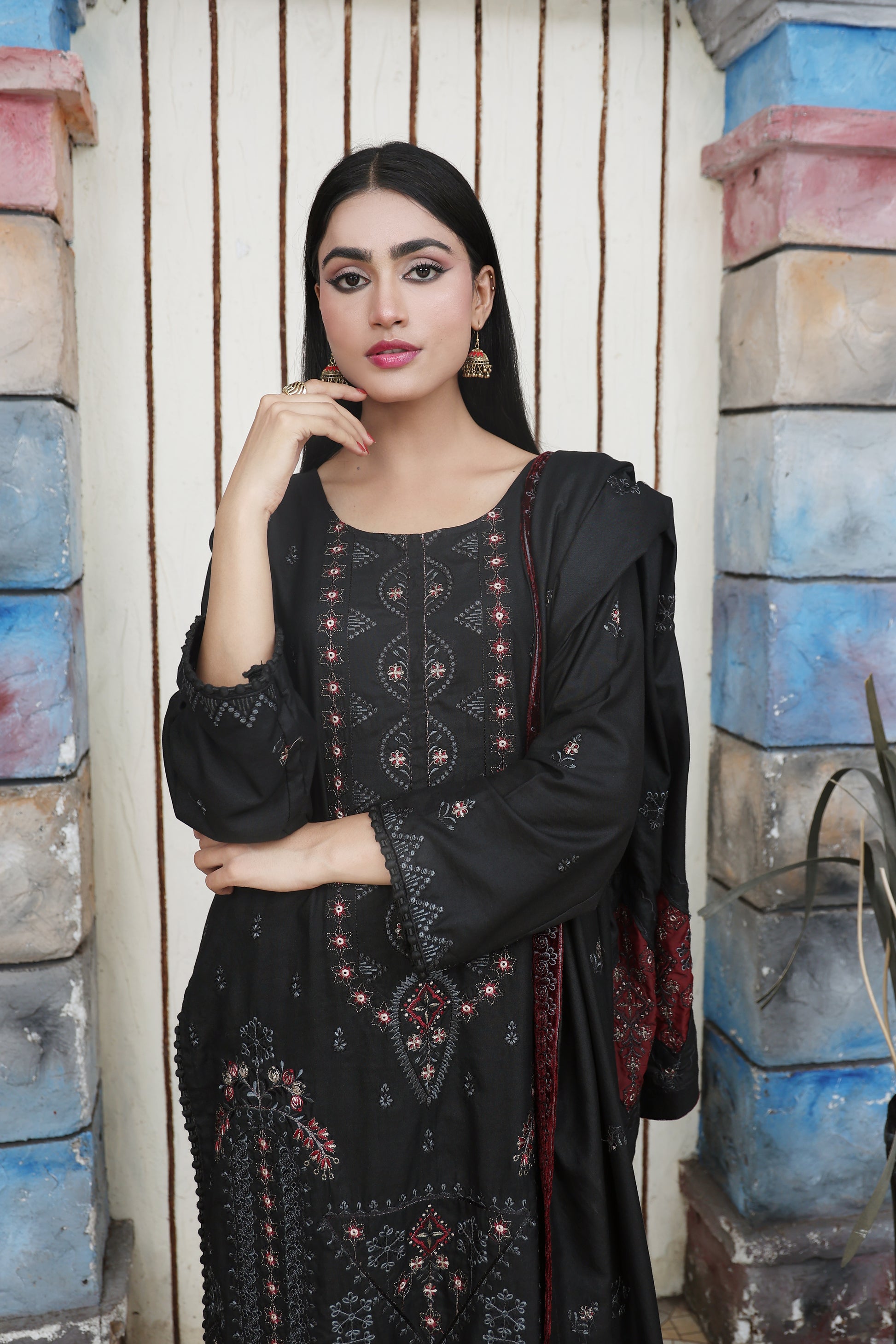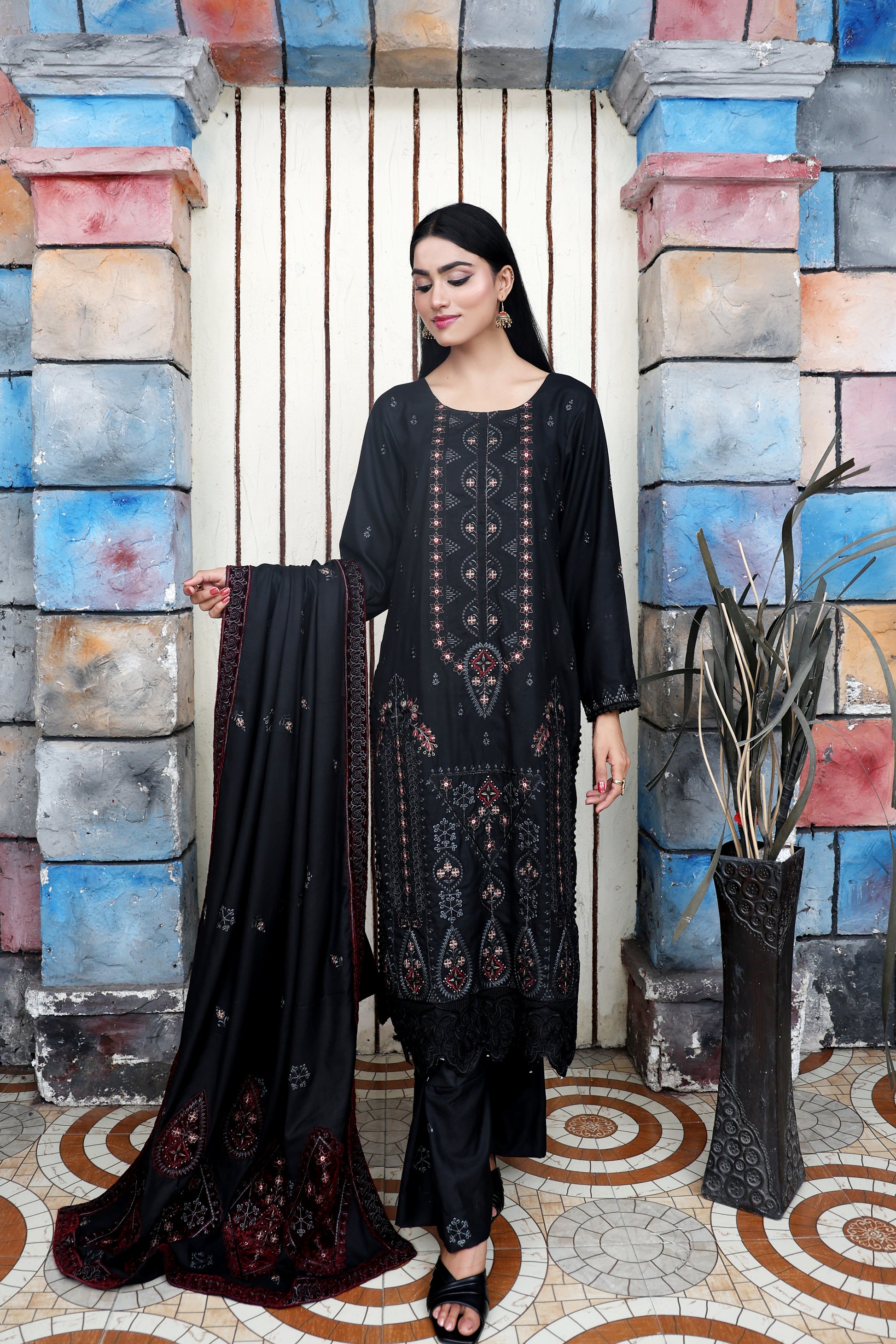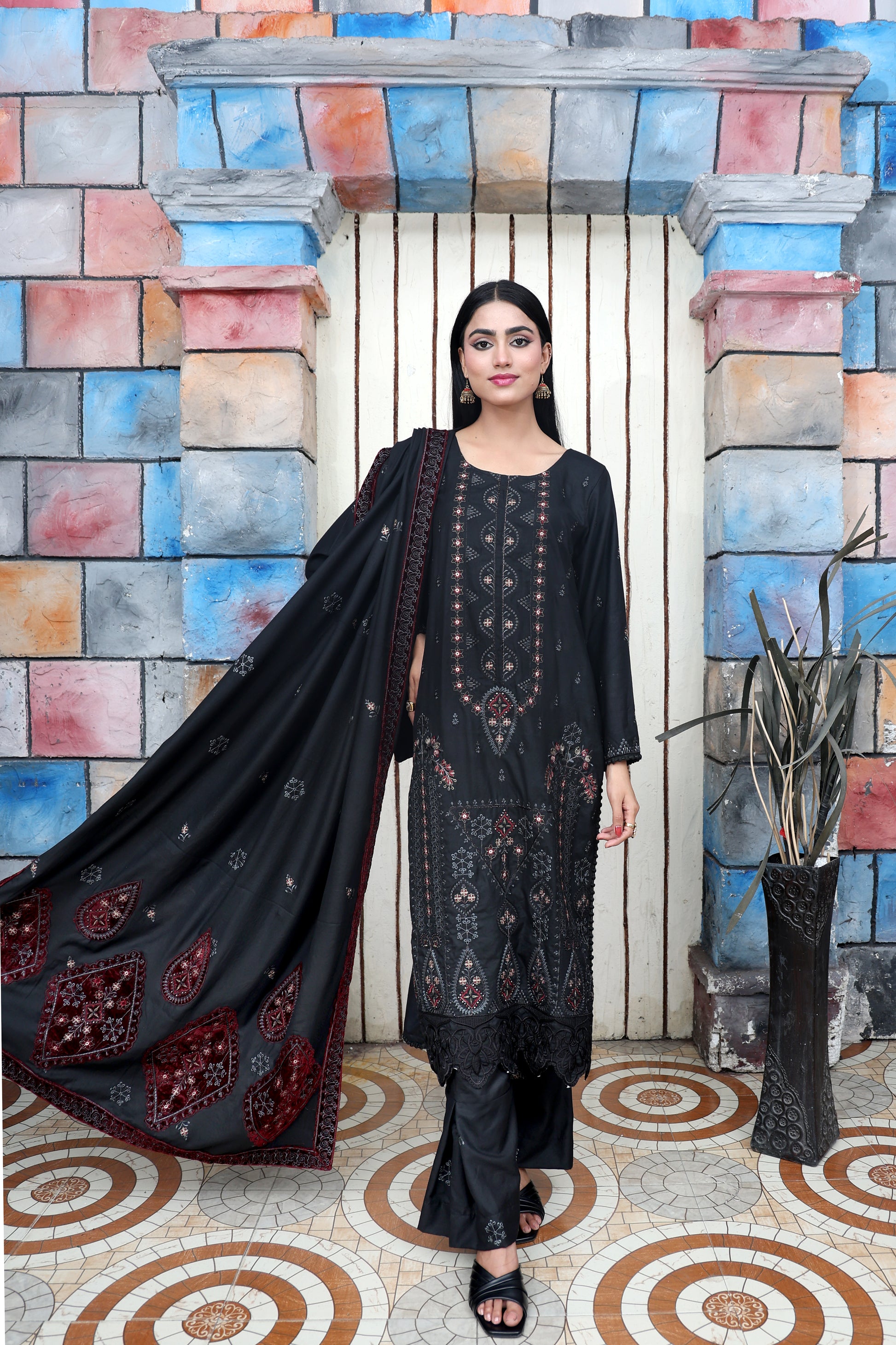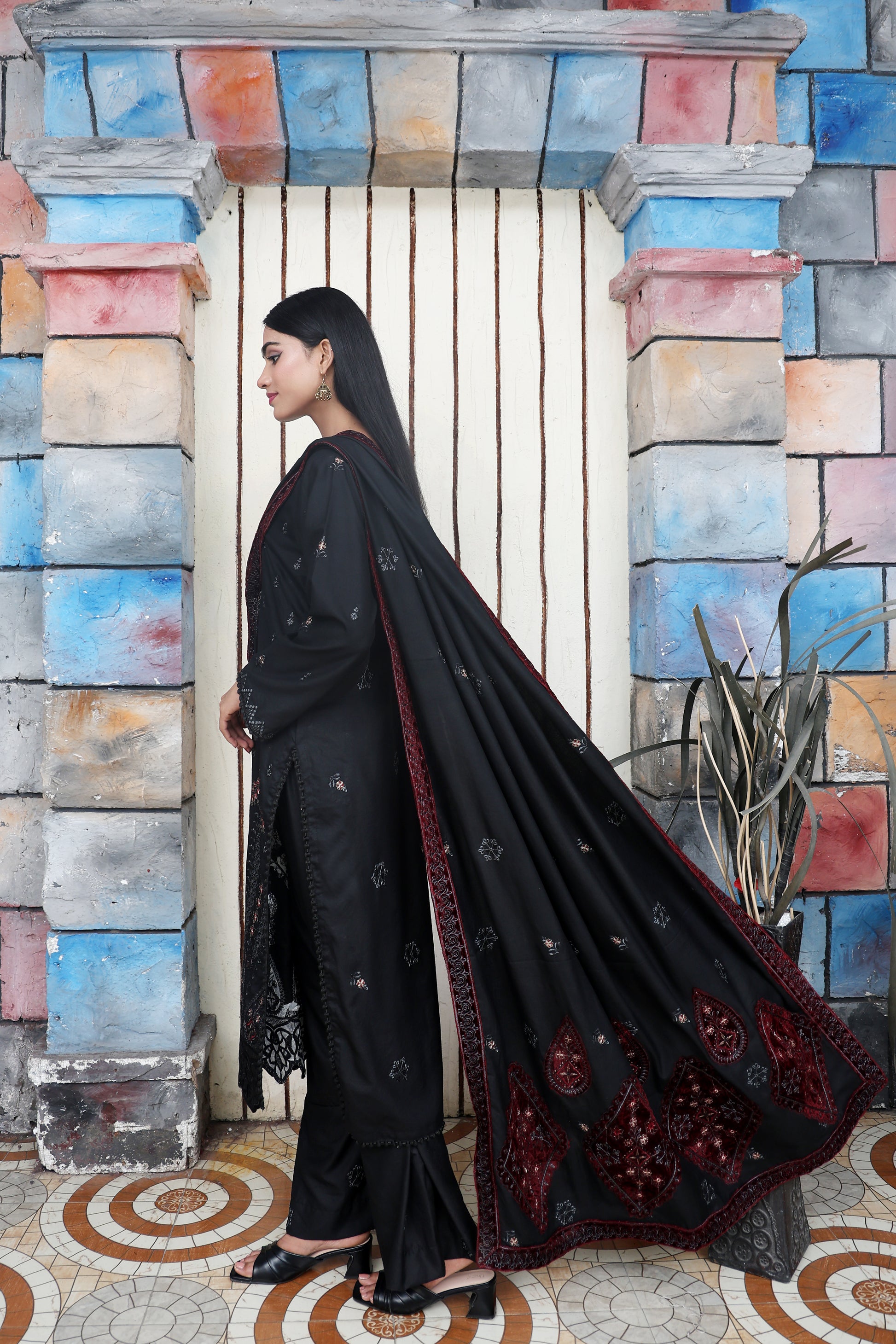 This three-piece dhanak set includes a premium embroidered shirt with front, back, and sleeves, an embroidered shawl with velvet patches, and a plain dhanak trouser.