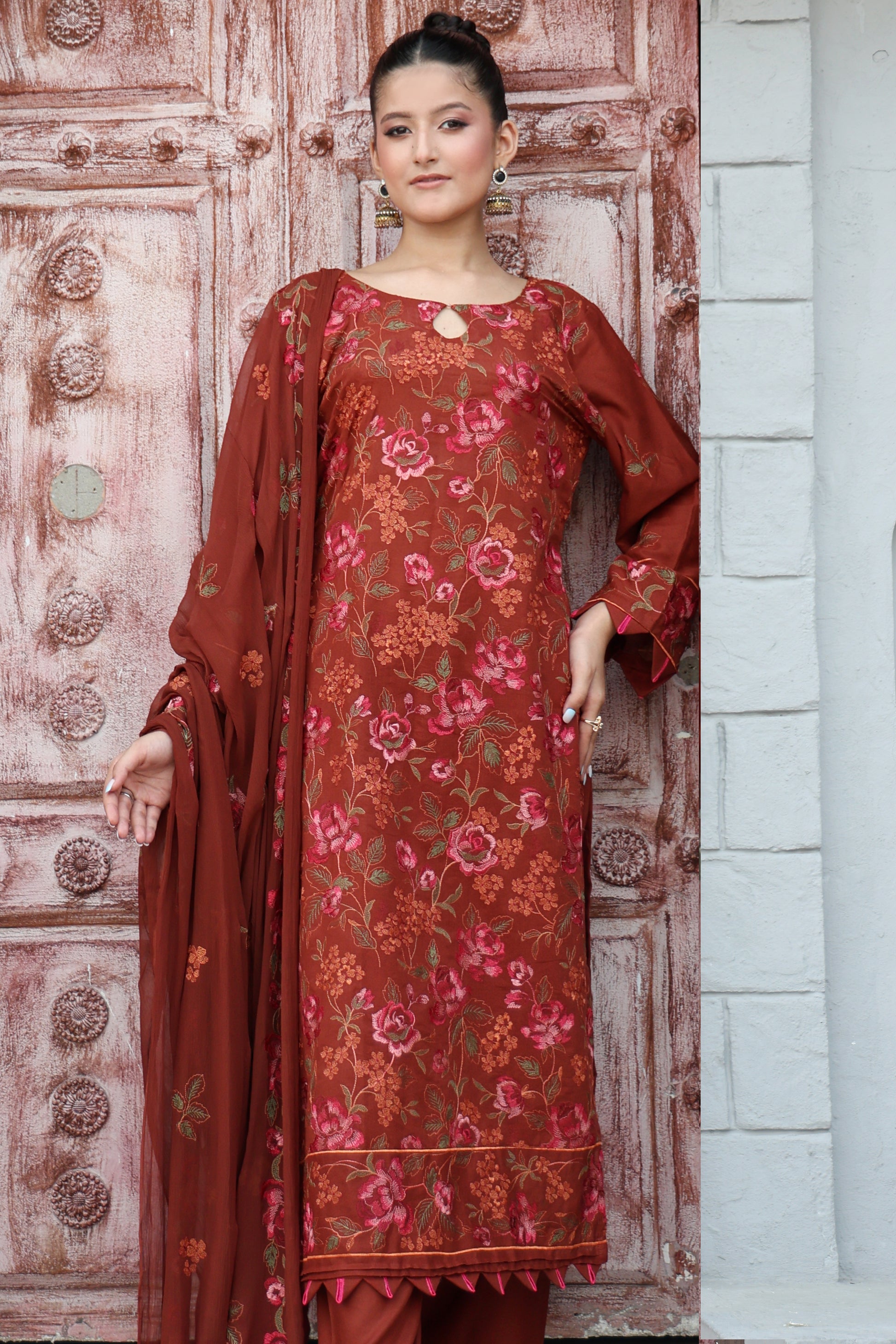 Premium Karandi shirt with delicate embroidery on the front, back, and sleeves, paired with a crinkle dupatta with embroidery and a plain Karandi trouser.