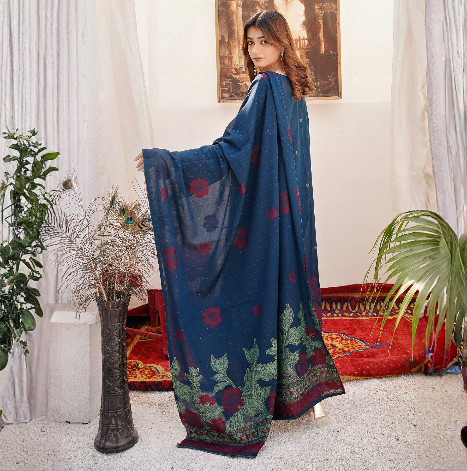 Paired with a stunning Airjet Lawn jacquard brosha shawl, adding sophistication and enhancing the overall look with a luxurious finish.