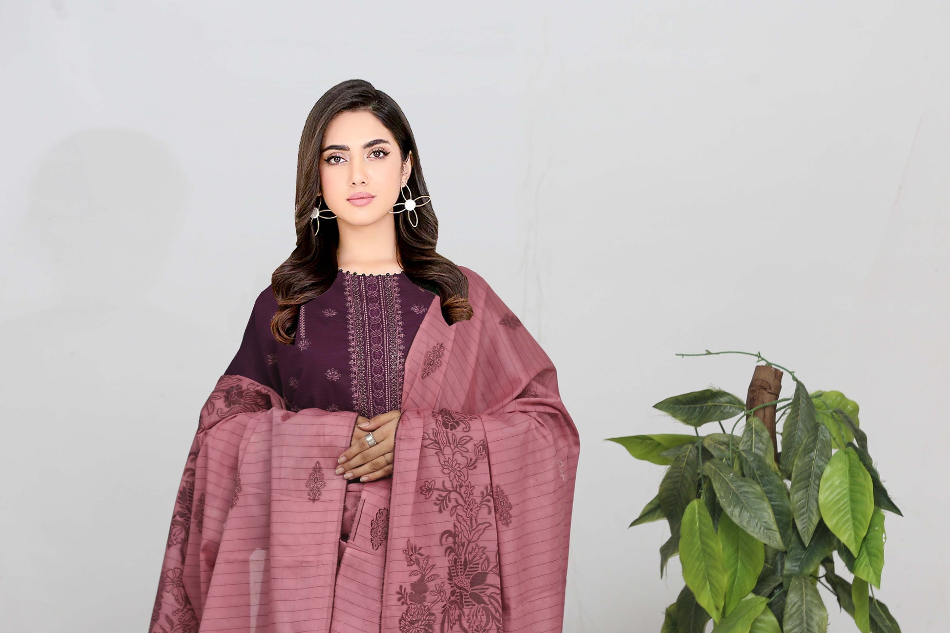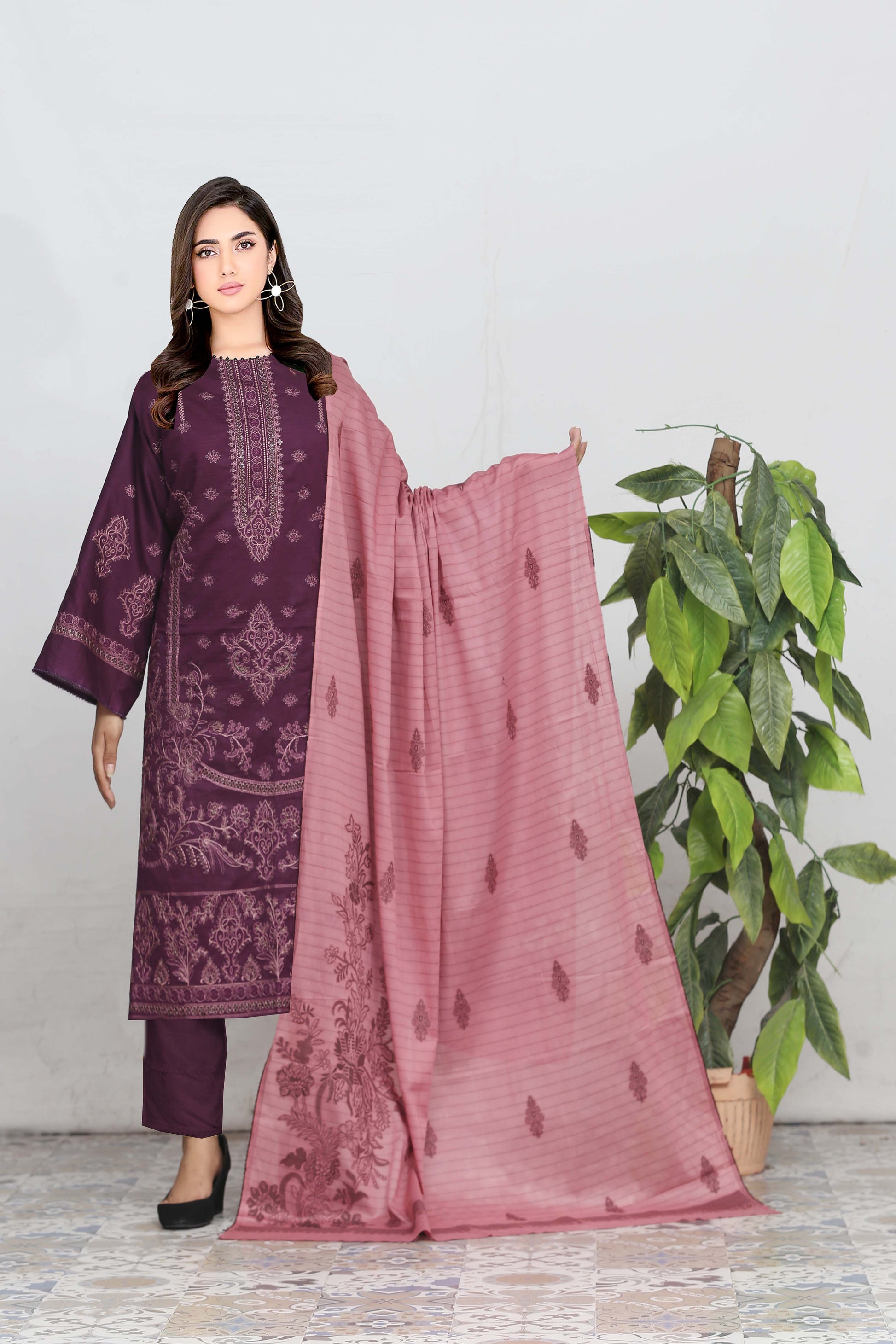 A graceful 3-piece outfit featuring an embroidered Bana Dora shirt (front, back & sleeves), a Lawn Jacquard Fancy Shawl, and a dyed Cambric Cotton trouser. Perfect for effortless elegance and everyday charm.