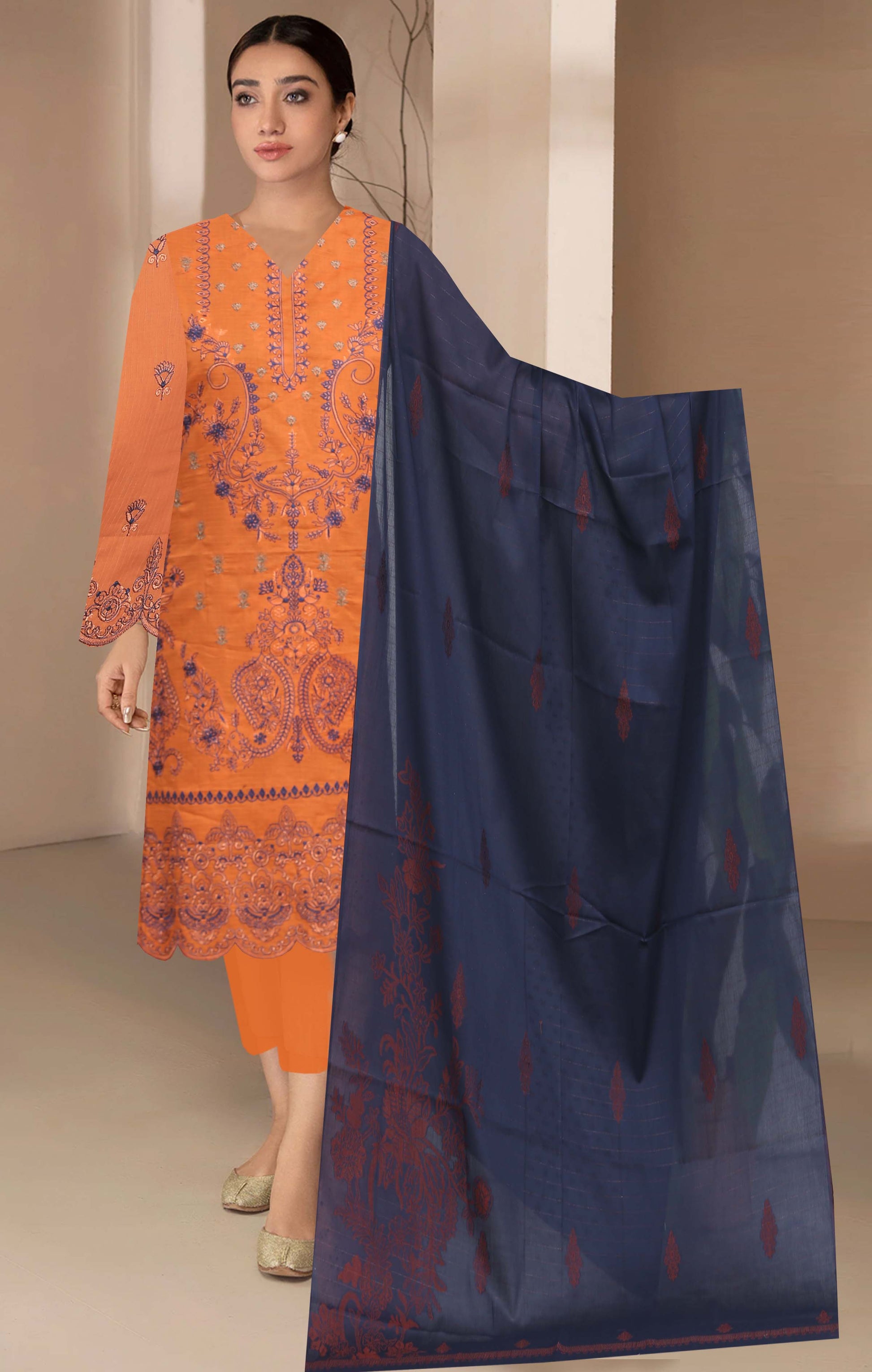 A graceful 3-piece outfit featuring an embroidered Bana Dora shirt (front, back & sleeves), a Lawn Jacquard Fancy Shawl, and a dyed Cambric Cotton trouser. Perfect for effortless elegance and everyday charm.